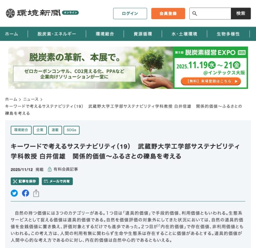 2025年11月12日、環境新聞にて「キーワードで考えるサステナビリティ(19) 武蔵野大学工学部サステナビリティ学科教授 白井信雄 関係的価値~ふるさとの礫島を考える」というタイトルの記事になりました。