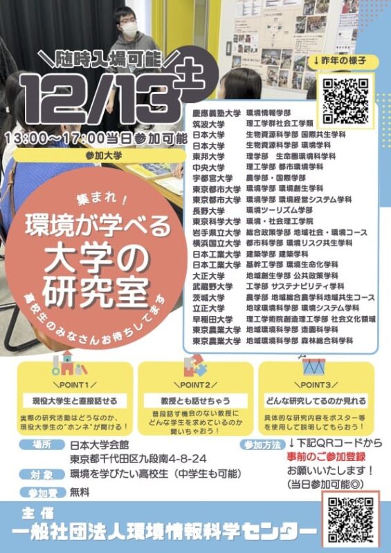 2025年12月13日(土)に環境を学べる首都圏の18大学の研究室が日本大学会館に集まり、高校生の皆さん向けの展示・説明会を開催します。