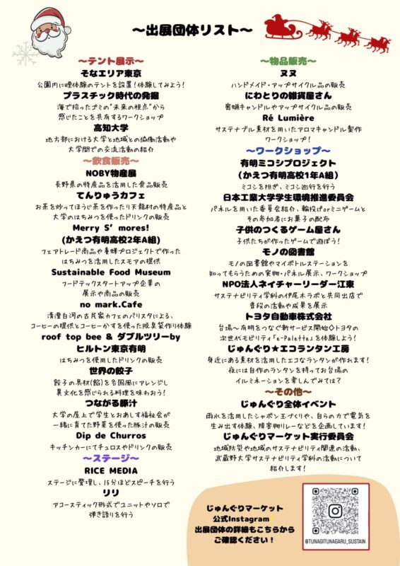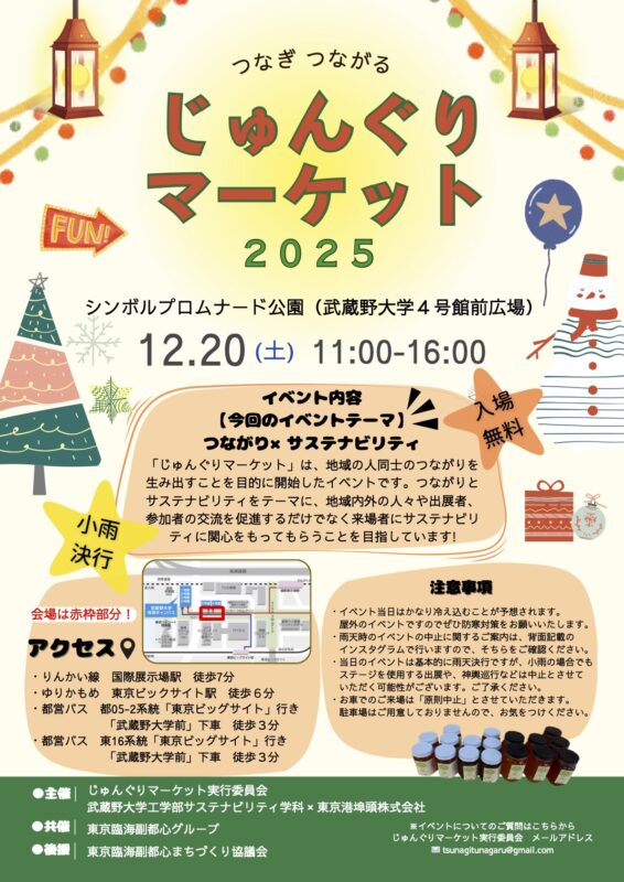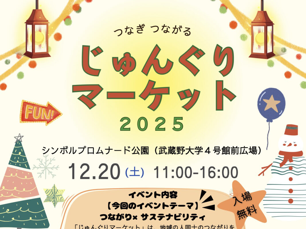 武蔵野大学工学部サステナビリティ学科の学生たちが主催し、今回で3回目の開催となるプチ学園祭「じゅんぐりマーケット2025」を2024年12月20日(土)に開催します!!