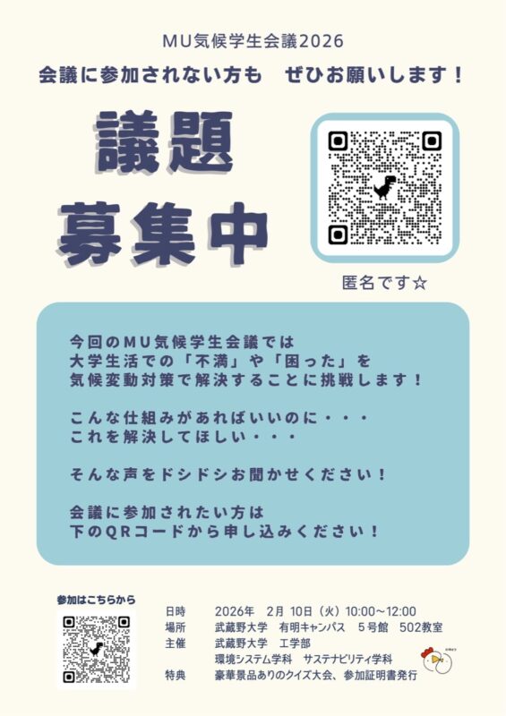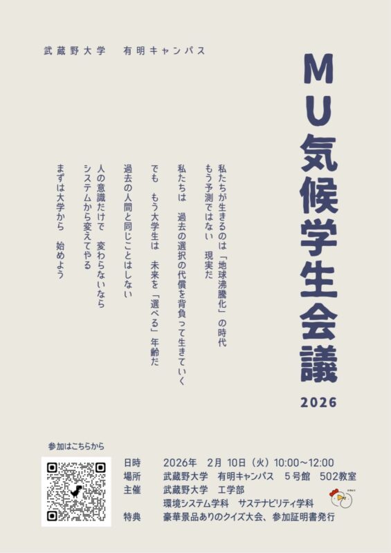 2026年2月10日、サステナビリティ学科の有志学生が中心となり、武蔵野大学有明キャンパスを会場に、第1回「MU気候学生会議」を実施します。