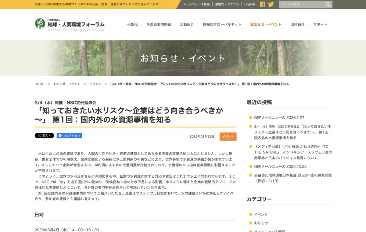 3/4(水)開催 NSC定例勉強会「知っておきたい水リスク~企業はどう向き合うべきか~」 第1回:国内外の水資源事情を知る | 一般財団法人 地球・人間環境フォーラム より