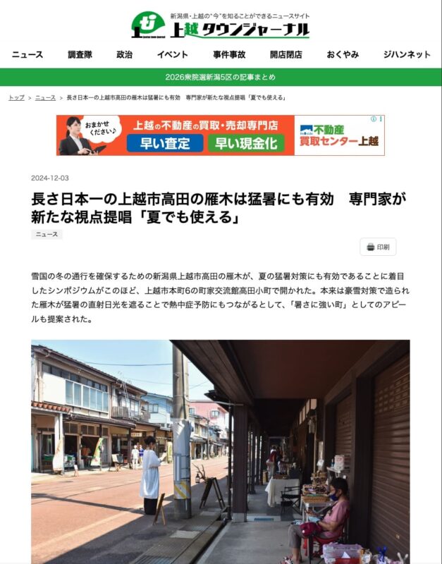 「長さ日本一の上越市高田の雁木は猛暑にも有効 専門家が新たな視点提唱『夏でも使える』」三坂育正教授が上越タウンジャーナルに掲載されました