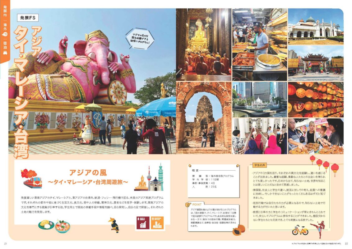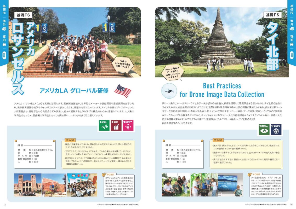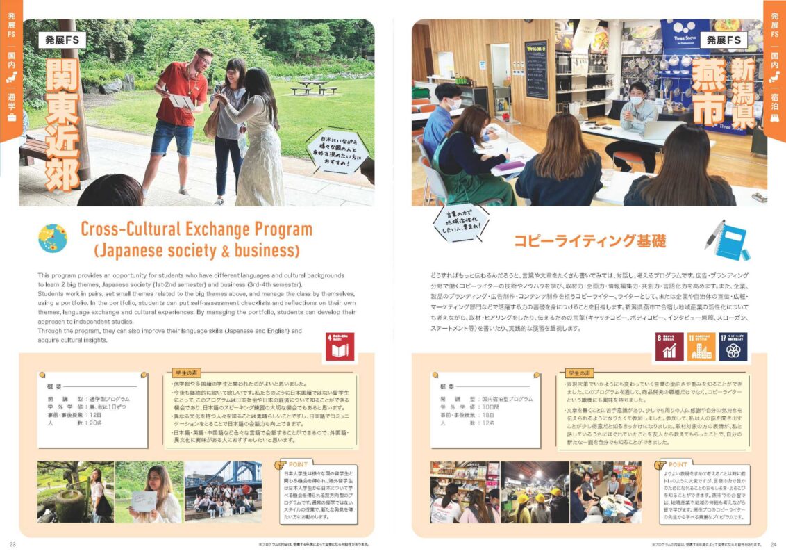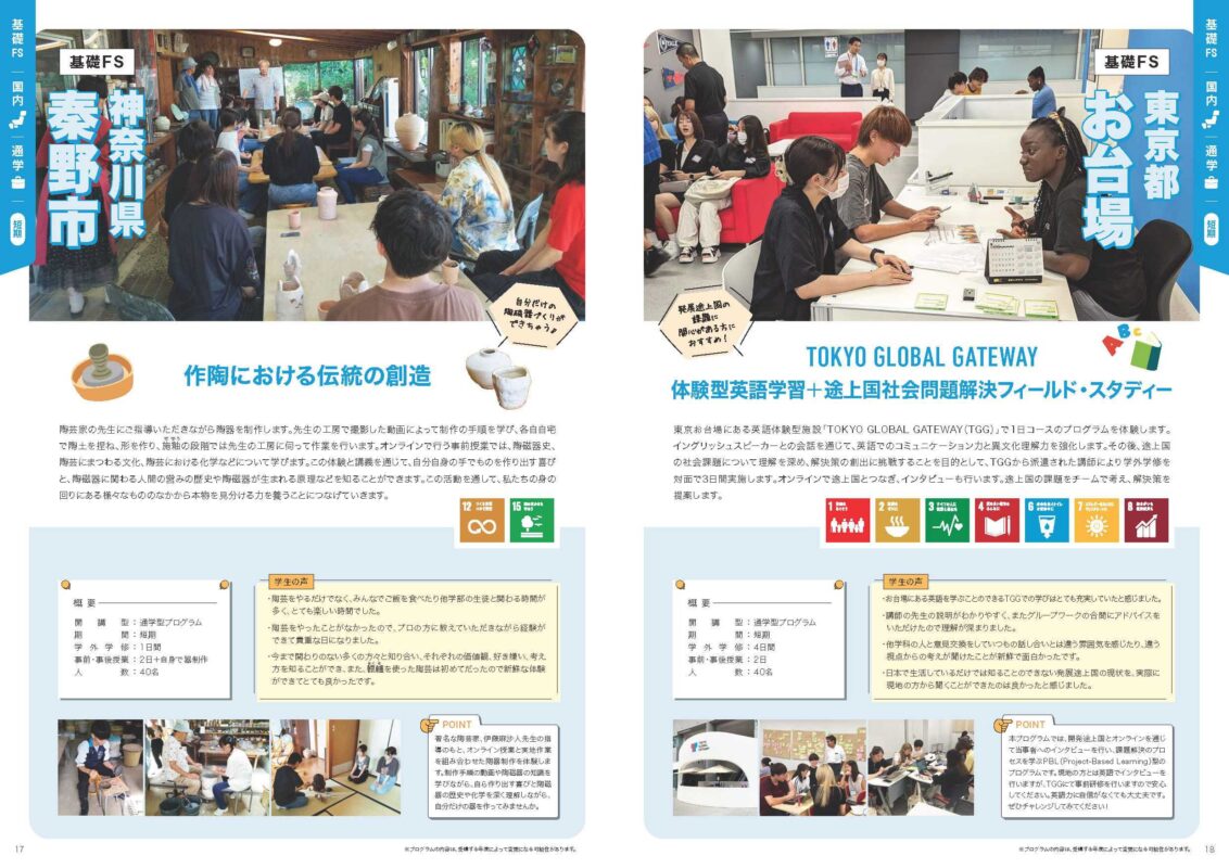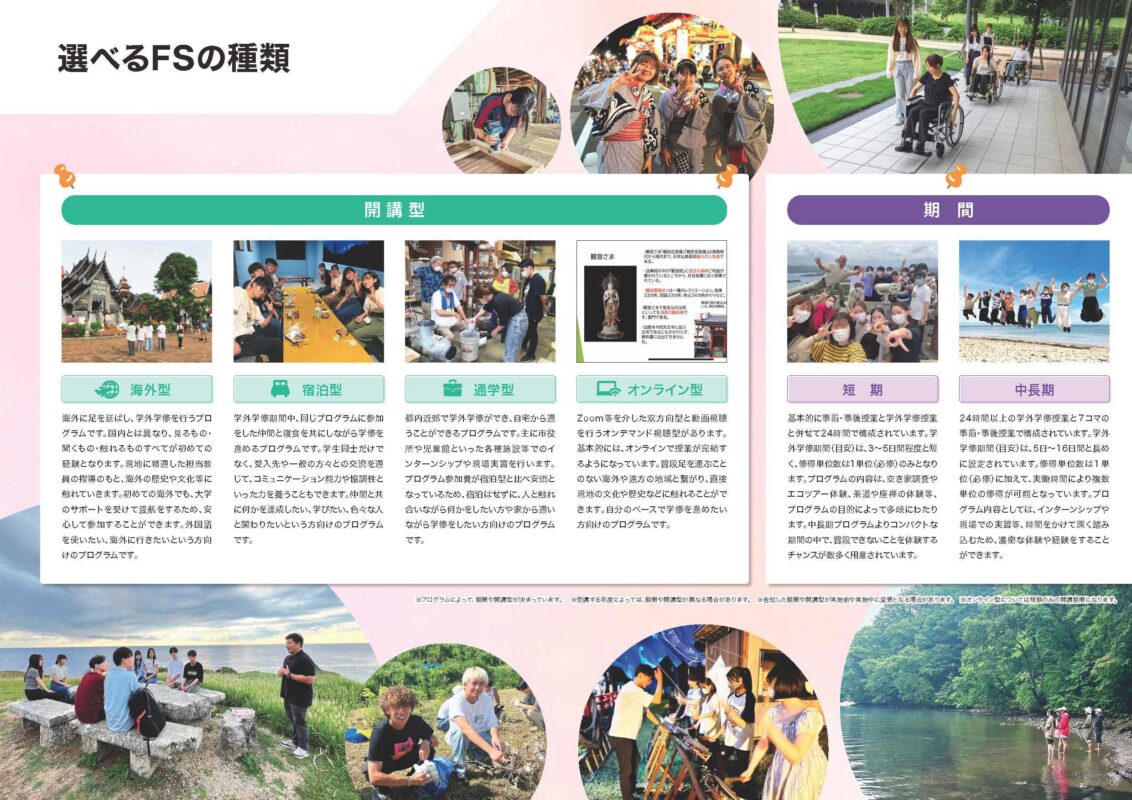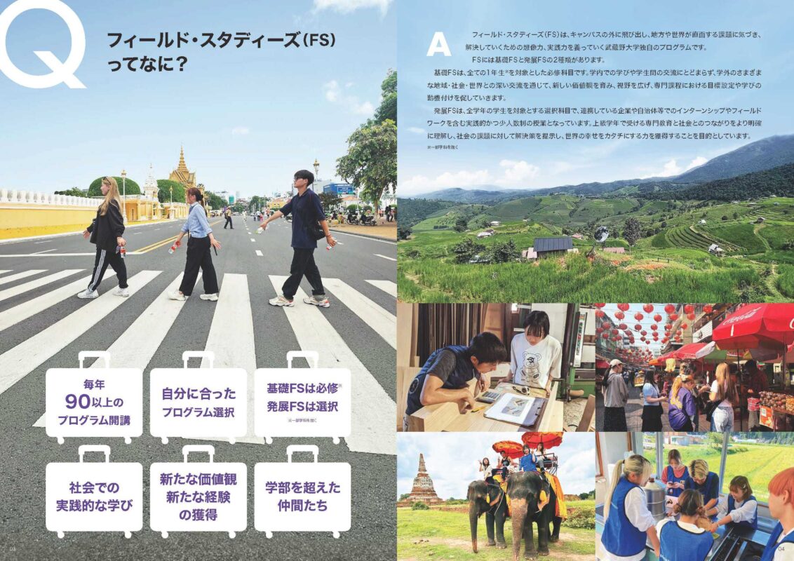 フィールド・スタディーズ(FS)は、キャンパスの外に飛び出し、地方や世界が直面する課題に気づき、解決していくための想像力、実践力を養っていく武蔵野大学独自のプログラムです。1年生を対象とした基礎FSと、全学年を対象とした発展FSの2種類があり、国内外合計90以上のプログラムから自分にあったプログラムを選択することができます。