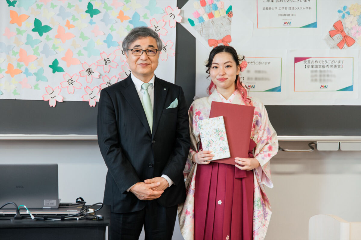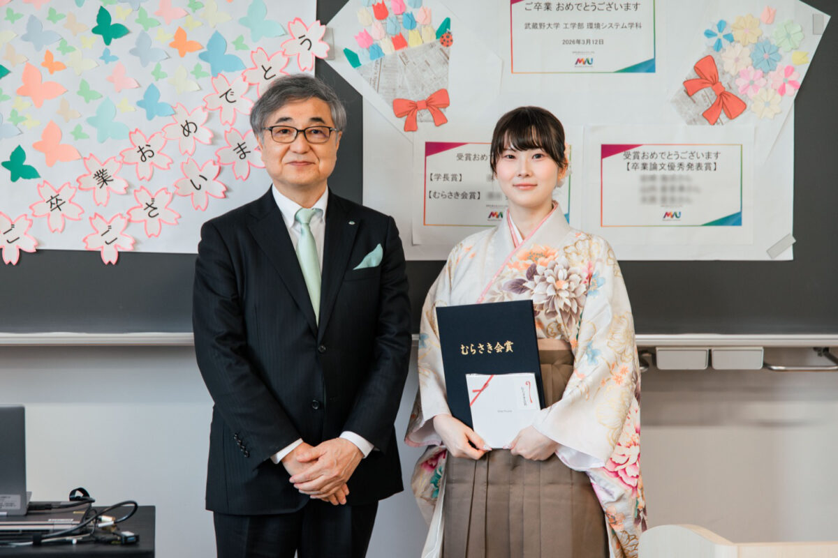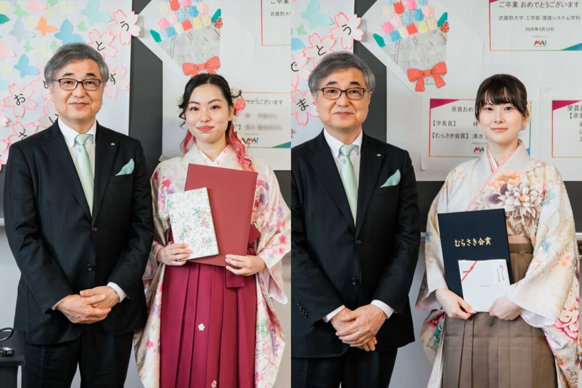 武蔵野大学の卒業式(2025年度)において、環境システム学科(現サステナビリティ学科)に在籍する林利咲さんに対して学長賞が、清水美知花さんに対してむらさき会賞が贈られました。