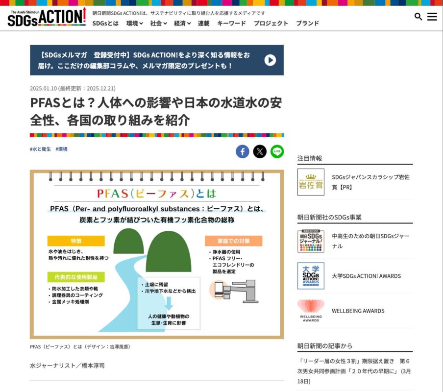 2025年1月10日、サステナビリティ学科の橋本淳司客員教授の記事「PFASとは?人体への影響や日本の水道水の安全性、各国の取り組みを紹介」が、朝日新聞デジタル「SDGs ACTION!」にて掲載されました。