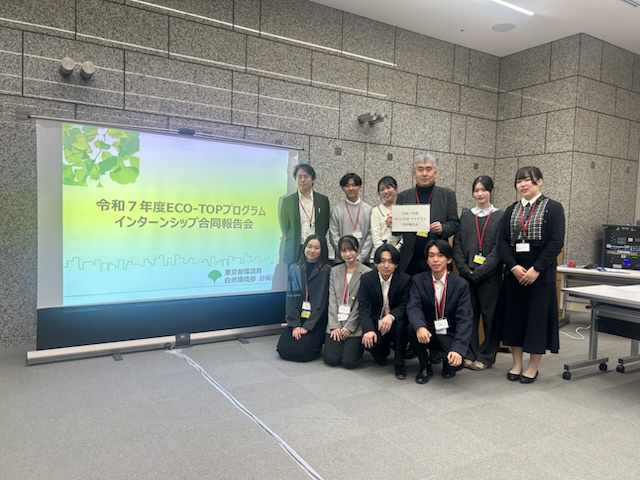 サステナビリティ学科が公認を受けている東京都の自然環境マネジメント人材育成プログラム「ECO-TOP プログラム」の令和 7 年度インターンシップ合同報告会が、2025年11月29日(土)に東京都庁にて開催されました。
